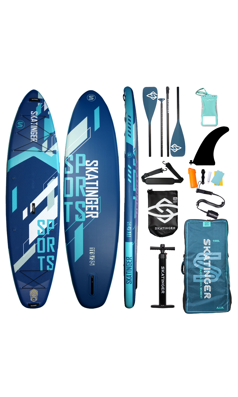 Das aufblasbare Blue Sports SUP Board von Skatinger wurde für vielseitige Einsätze und ausgewogene Performance entwickelt – ideal für Yoga, Fitness, leichtes Touring oder entspanntes Freizeitpaddeln. Mit einer großzügigen Länge von 350,5 cm und einer Breite von 89 cm bietet es außergewöhnliche Stabilität und sichere Kontrolle, auch für Einsteiger oder schwerere Paddler.