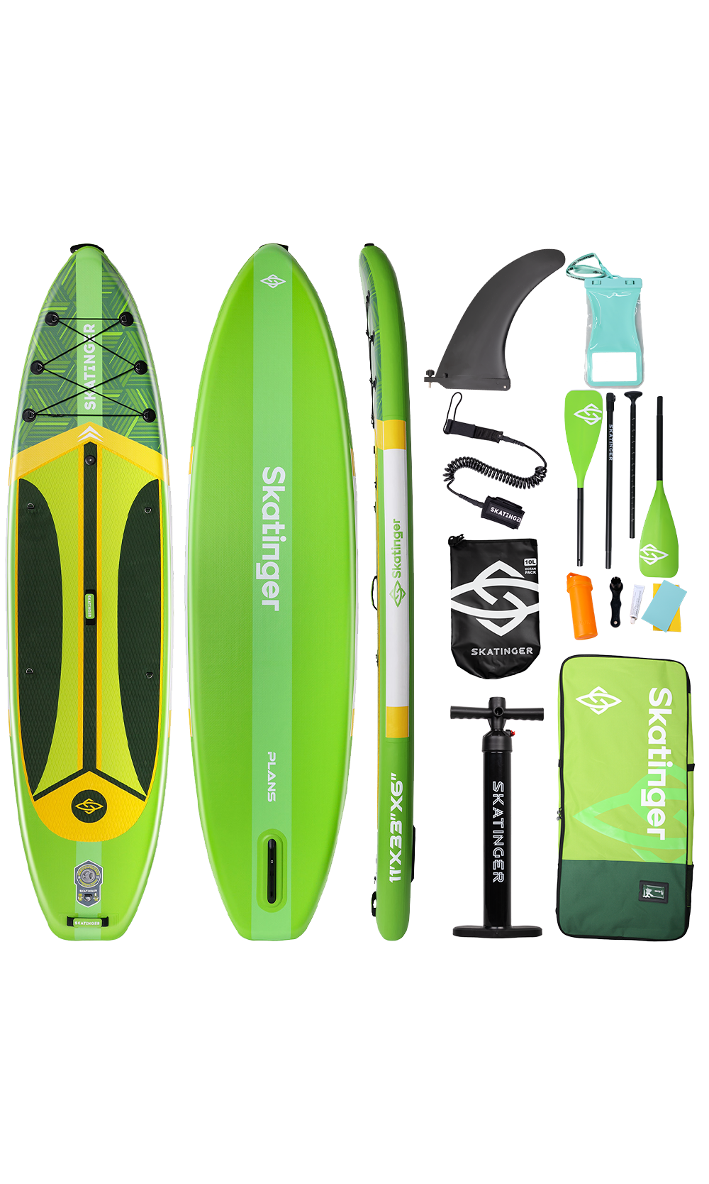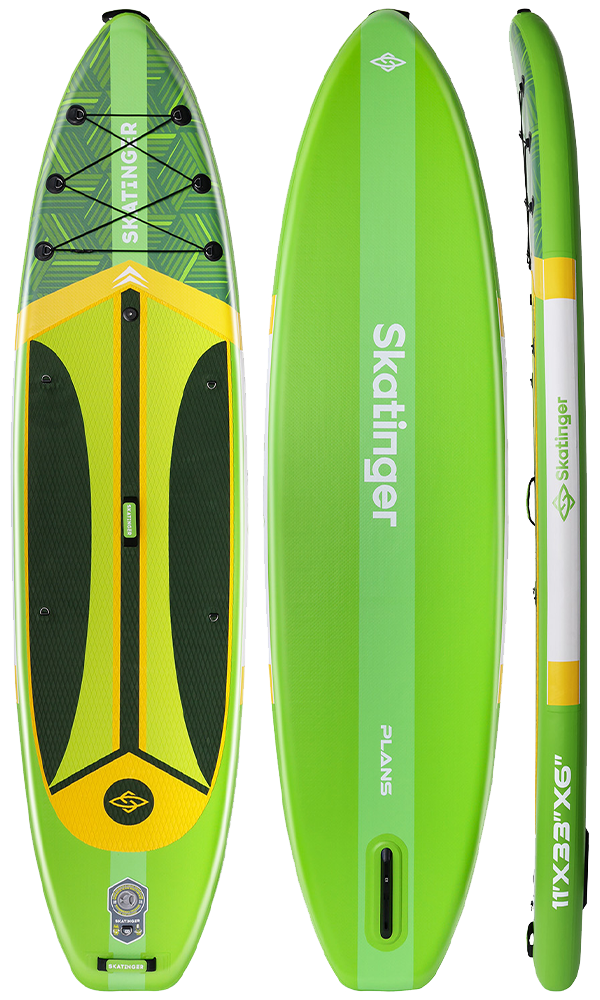 Das Plans Green SUP Board ist für alle gemacht, die sich frei bewegen, sicher stehen und mit spielerischem Selbstvertrauen paddeln möchten. Mit seinem leuchtenden Neongrün und den markanten gelben Details bringt dieses Board Persönlichkeit in ruhige Morgenstunden, entspannte Nachmittage und farbenfrohe Abenteuer auf dem Wasser.