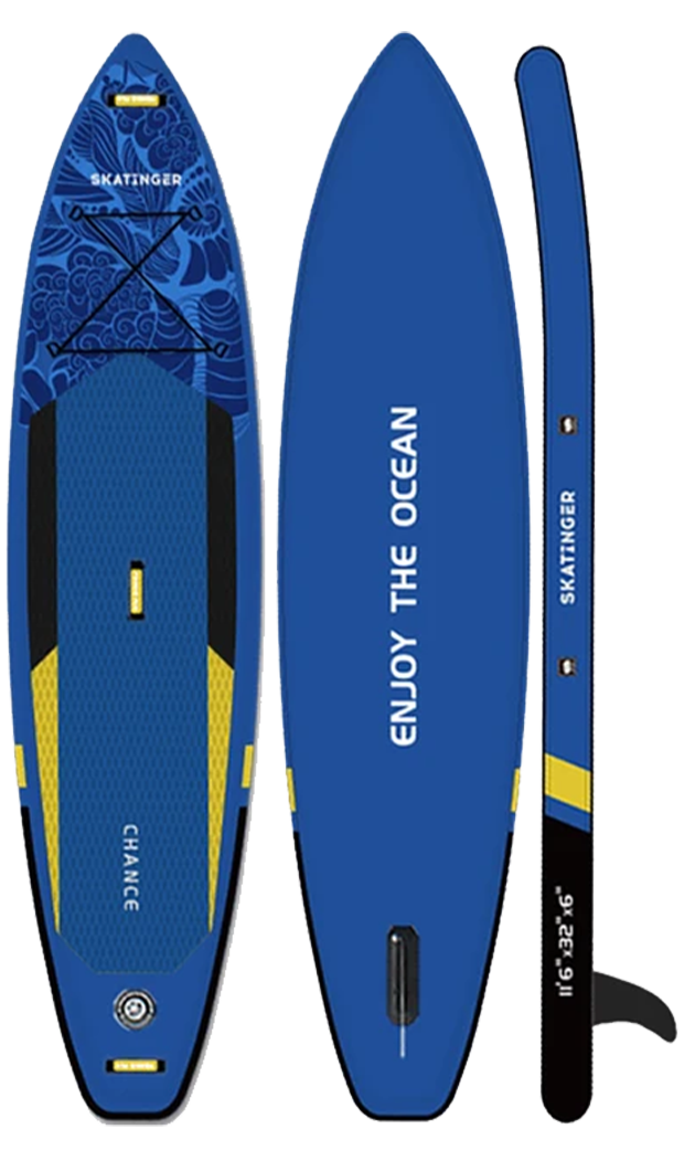 Das Chance Blue Touring SUP Board wurde für Paddler entwickelt, die Ausdauer, fließende Bewegung und ein klares Design schätzen. Tiefe Ozeanblautöne, geometrische Akzente und eine kraftvolle Silhouette vermitteln Kontrolle, Komfort und Sicherheit auf längeren Distanzen und in offenem Gewässer.