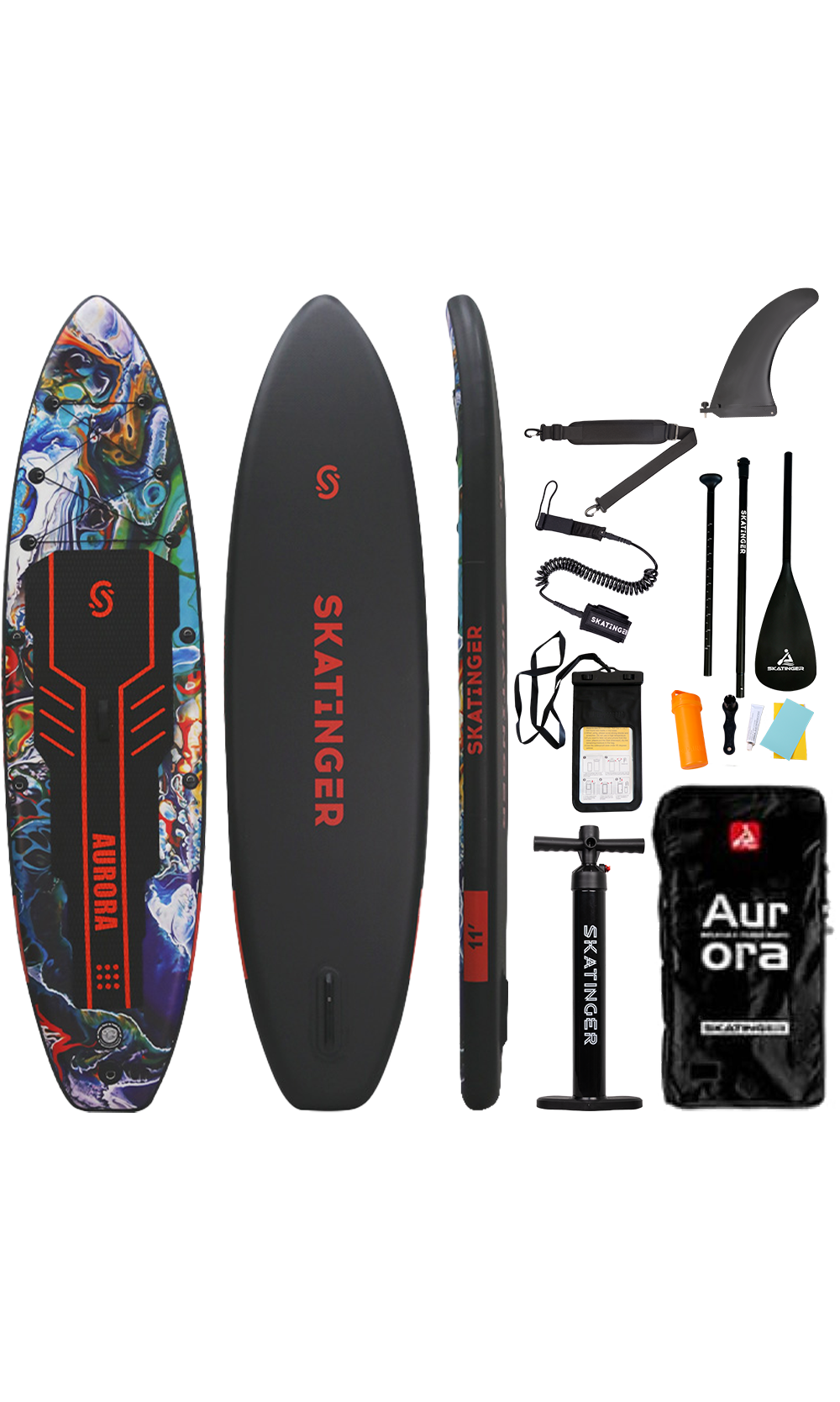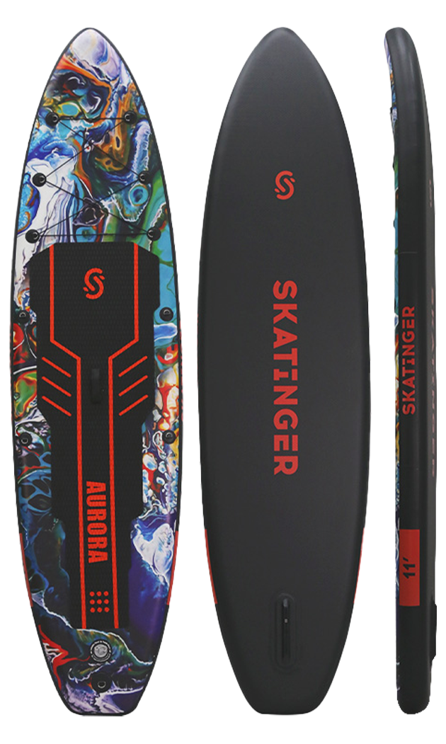 Aurora Black vereint die Mystik des Nachthimmels und die wirbelnde Pracht der Nordlichter in einem eleganten, kraftvollen SUP Board. Mit markanten orangefarbenen Akzenten auf tiefen kosmischen Mustern ist es für alle gemacht, die nicht einfach paddeln, sondern Präsenz zeigen. Ideal für längere Touren, entspanntes Gleiten am See oder stimmungsvolle Sessions bei Sonnenaufgang.